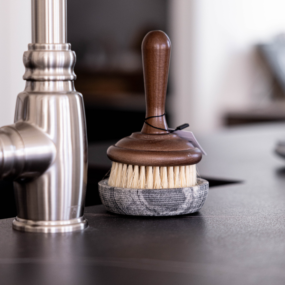 The Grey Marble Soap & Brush Holder is both practical and stylish, making it a great addition to any kitchen. It adds a chic touch to your sink while helping keep your counters free from soap messes and water drips.