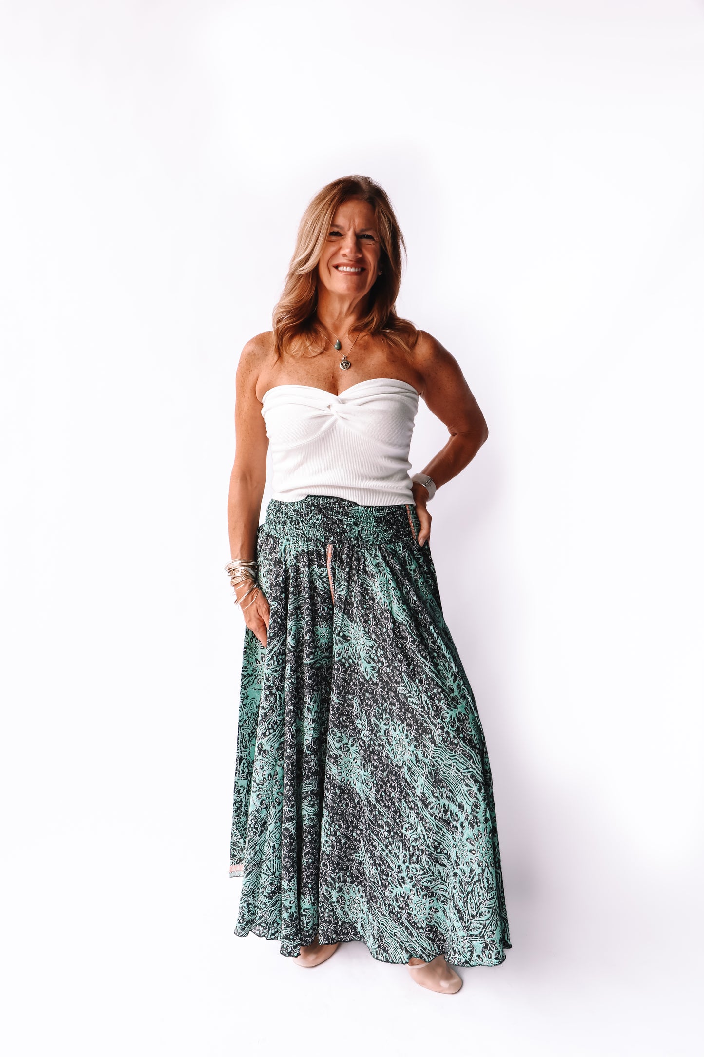 The Palazzos by AW in Midnight blend deep emerald and onyx tones in a mesmerizing geometric print that feels both timeless and bold.