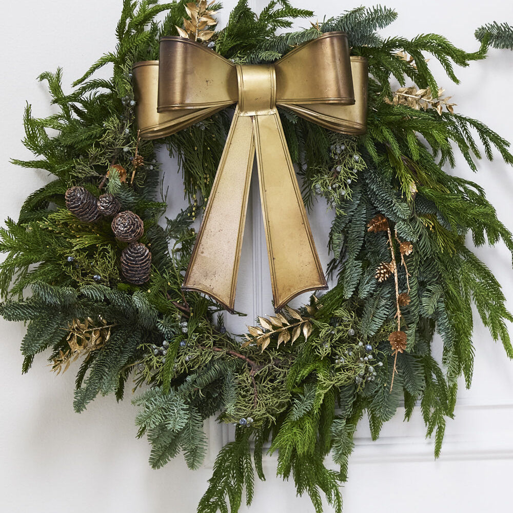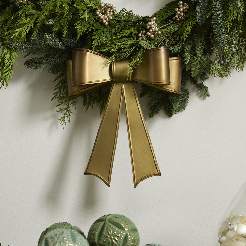 Create a festive and inviting entryway with the Bow Wreath, a lightweight, large-scale metal bow with an aged brassy finish. This classic bow hangs from a gold chain and can be styled as a singular piece, or looks stunning layered onto a fresh wreath of greenery. Double layered loops give this style lots of dimension and the aged finish is a nostalgic nod to vintage holiday decor. We recommend styling on a door that has an overhead covering or bringing this beautiful bow inside for a fresh holiday display!