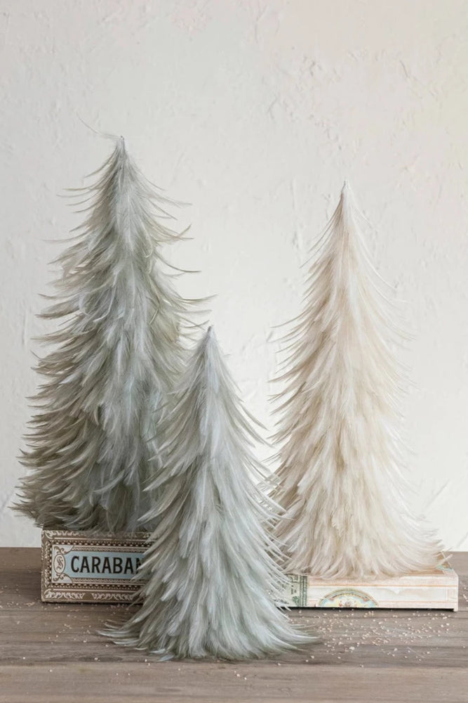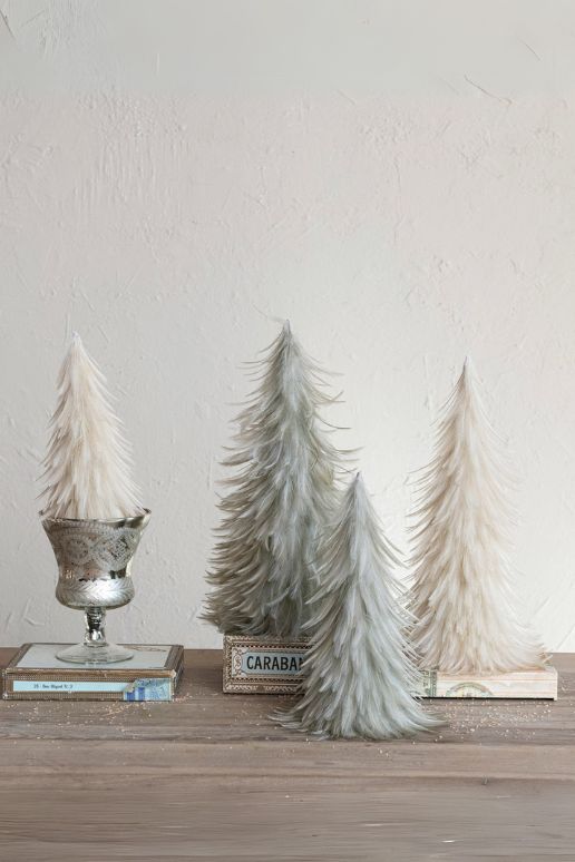 This set of decorative feather trees is a beautiful and convenient way to decorate for the holidays. It features a set of 2 feather trees in cream that create a soft and fluffy effect, making them look like they are covered in snow. The trees are ideal for displaying on a table, shelf, or floor, where they can add a touch of whimsy and color to any space.