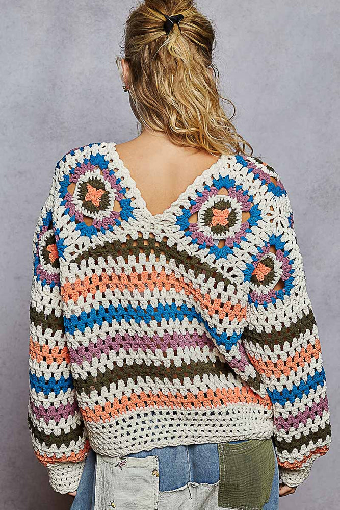 Designed in V-neck balloon sleeve relaxed fit sweater top in chenille with granny square pattern.
