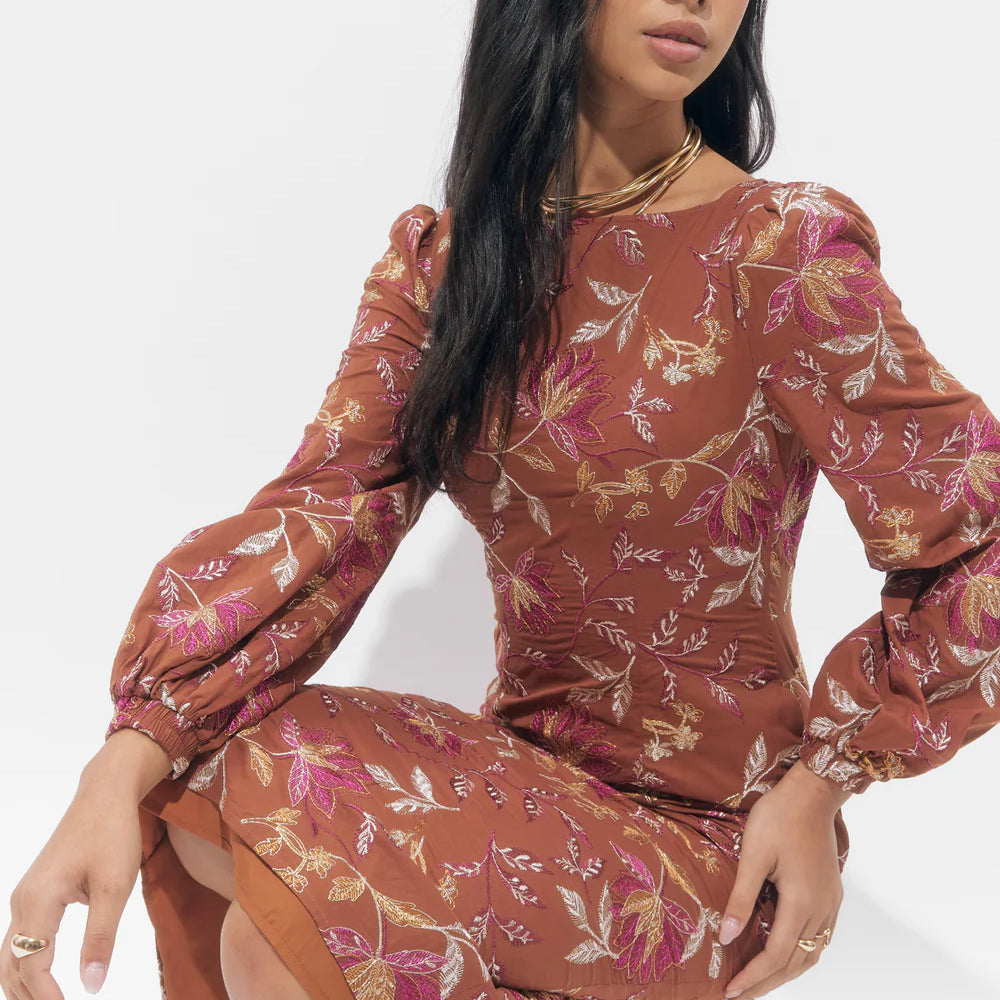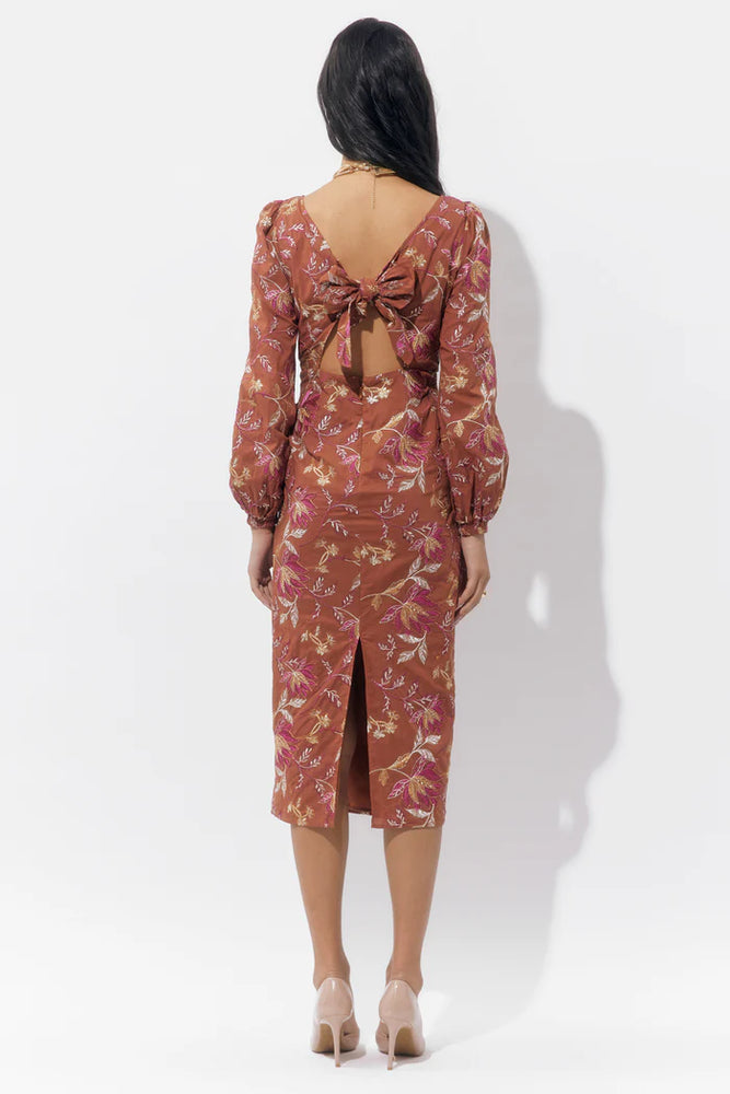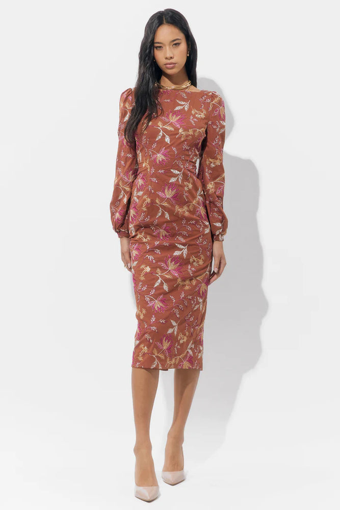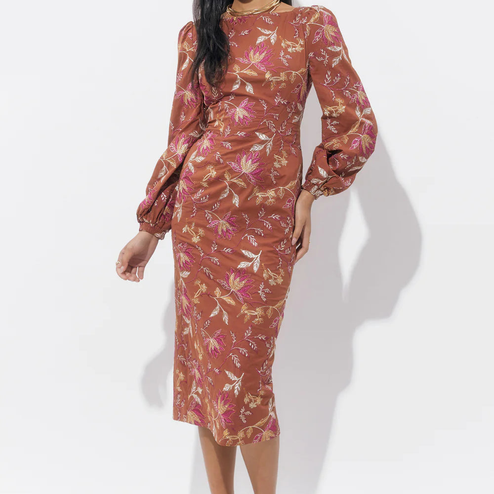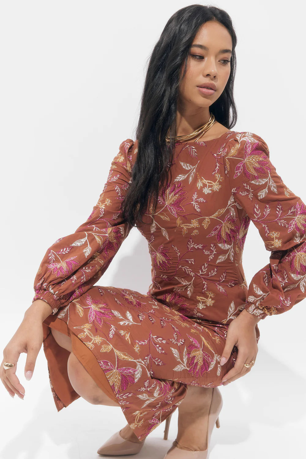 This dress is crafted from a soft, lightweight fabric with a vibrant brown and magenta floral print. The long sleeves add a sophisticated touch, while the midi length and side slit create a beautiful, flowing drape.