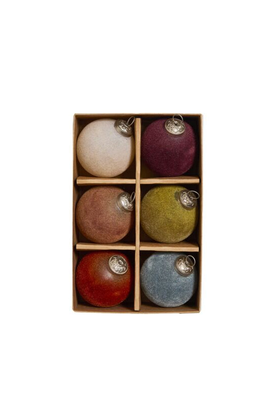 Ground the Christmas tree in stunning jewel tones and soft velvet texture with the Velvet Ornament Set. This set of six includes classic ball shaped ornaments in turquoise, cinnamon, plum, moss green, off white, and cranberry hues. Detailed gold caps pair beautifully with the texture of the ornaments and unite this collection of colorful ornaments. This set comes in a craft paper box with a clear plastic lid, ready for retail merchandising during the busy holiday season.
