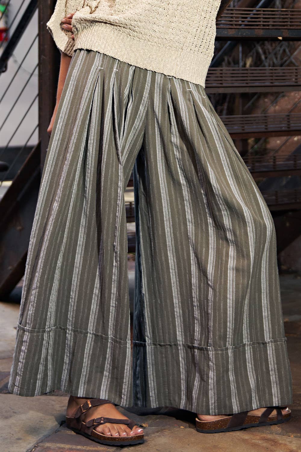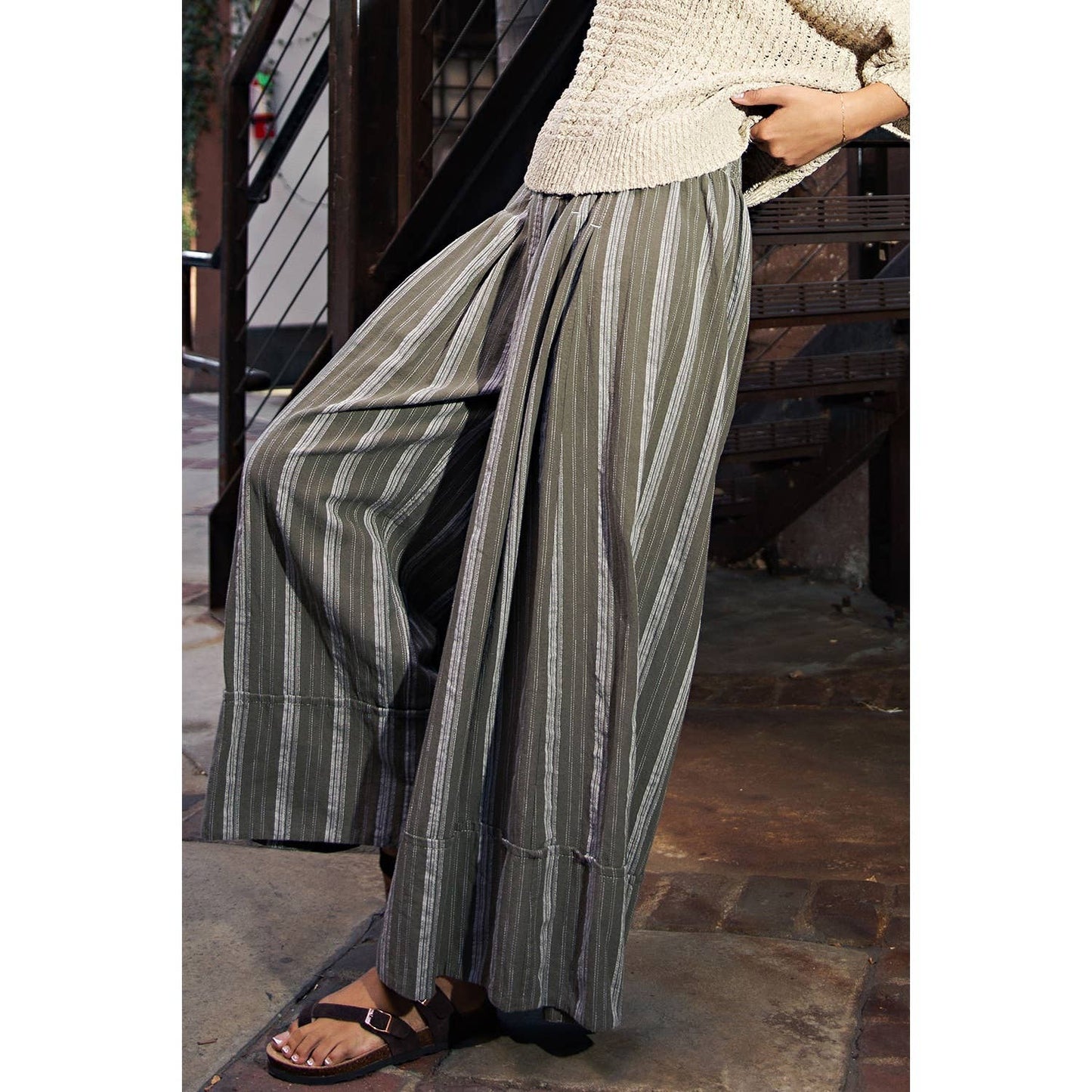 Embrace a touch of playful elegance with these charming olive crop pants, adorned with subtle stripes that dance along the fabric. Perfect for those who love to mix comfort with a hint of quirky sophistication, these pants bring a delightful twist to your everyday wardrobe. The cropped silhouette offers a modern, whimsical vibe that pairs beautifully with sneakers or sandals for an effortless look.