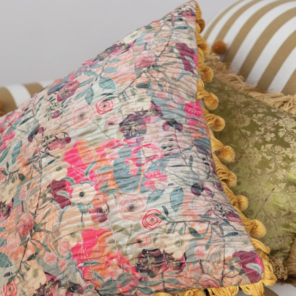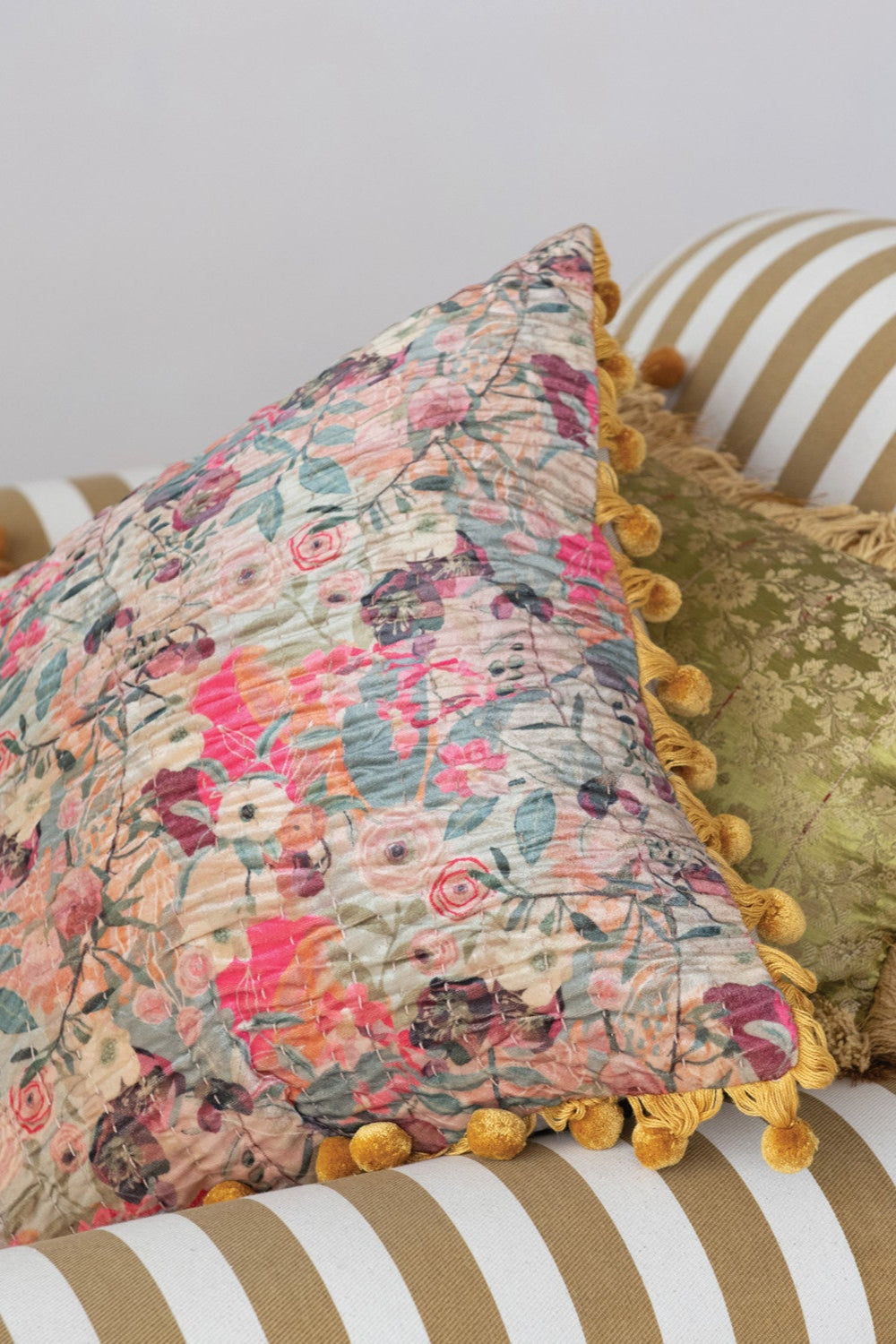 Velvet Printed Pillow w/ Hand-Embroidered Kantha Stitch, Pom Poms & Chambray Back