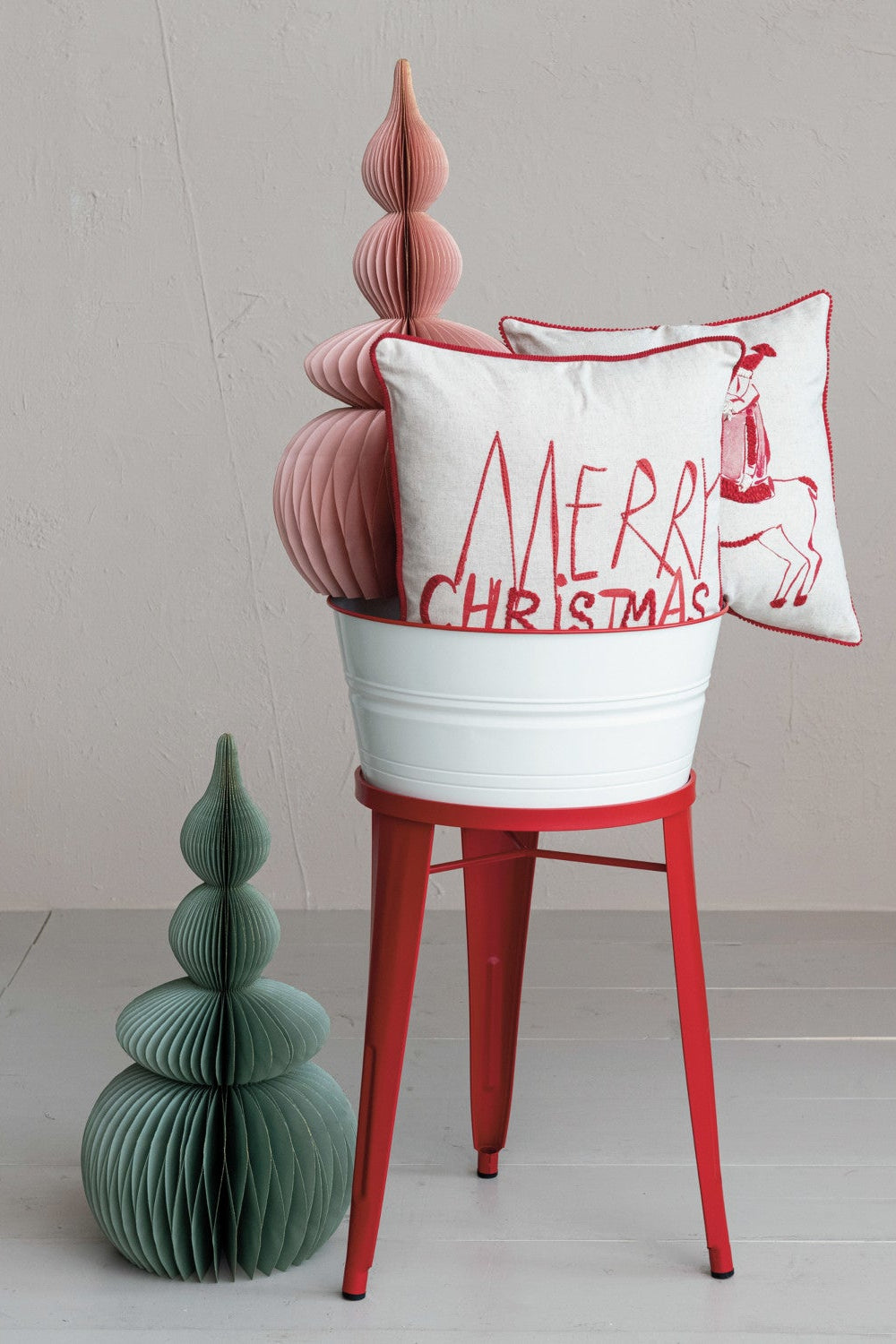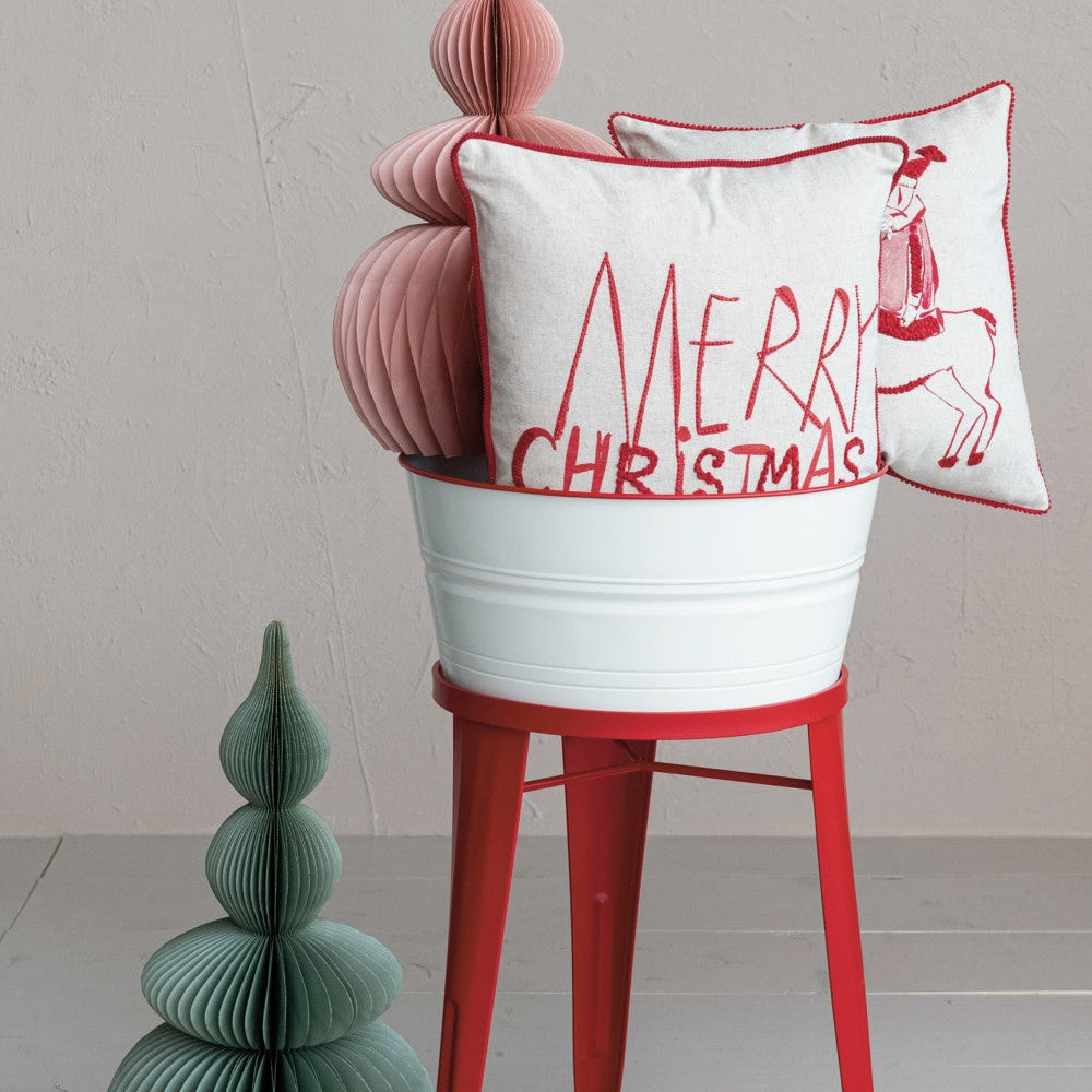 This square pillow captures the essence of the holiday season with its charming "Merry Christmas" embroidery on a printed cotton canvas. The natural and red colors create a warm and inviting atmosphere, while the corduroy back adds a luxurious texture. Finished with meticulous piping, this pillow is a delightful way to adorn the home with the spirit of Christmas and provide a welcoming touch to any room. It measures 18.0 in length and 18.0 in height, making it a versatile addition to any seating area. Whether it's nestled on a sofa or gracing a guest bed, it's sure to bring smiles and comfort during the festive season. A festive square pillow with a natural cotton front, beautifully printed and embroidered with the greeting "Merry Christmas" in a vibrant red hue. An inviting addition to the seasonal decor, this pillow is perfect for spreading holiday cheer in any living space or bedroom. A plush polyester fill gives this pillow a full, firm shape.