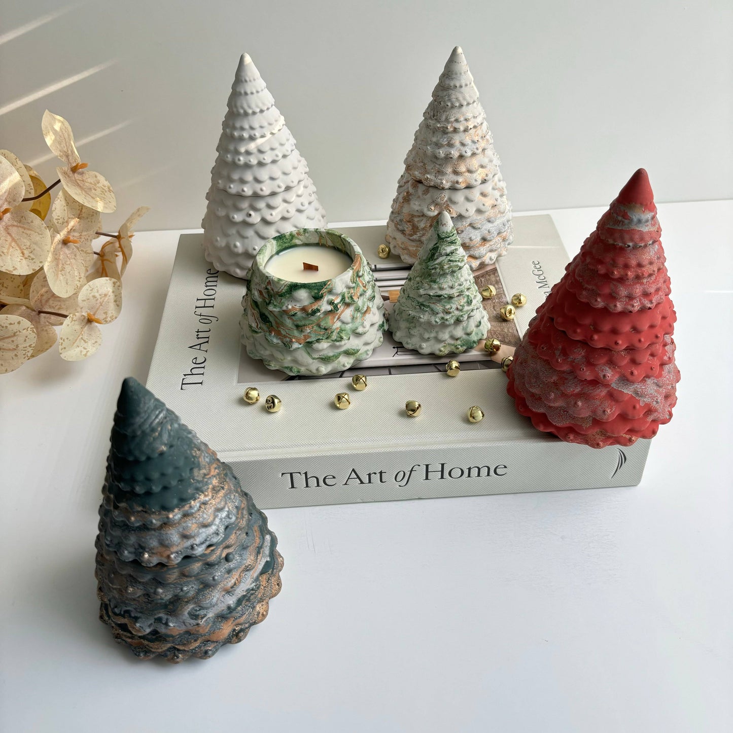 A Christmas tree candle pot made out of concrete features a modern, minimalist holiday design. The pot is shaped like a stylized Christmas tree, with tiered layers. Its natural concrete texture adds a refined yet industrial charm, with smooth surfaces and subtle variations typical of the material.