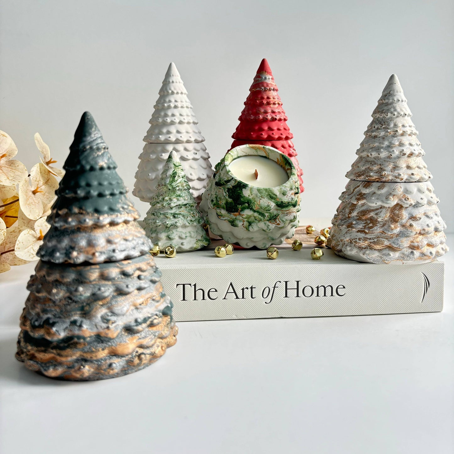A Christmas tree candle pot made out of concrete features a modern, minimalist holiday design. The pot is shaped like a stylized Christmas tree, with tiered layers. Its natural concrete texture adds a refined yet industrial charm, with smooth surfaces and subtle variations typical of the material.