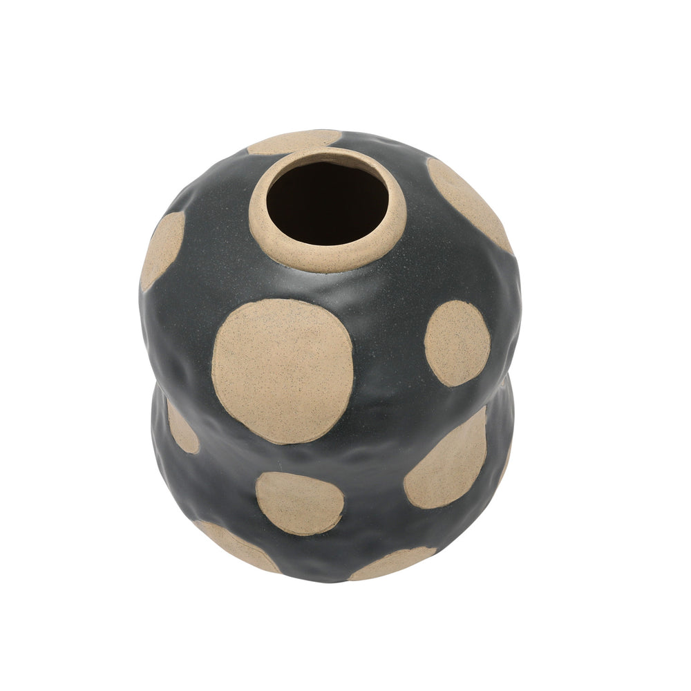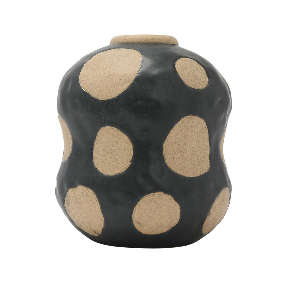 This stylish and eye-catching vase features wax relief dots that create a contrasting and textured pattern on the matte black and cream surface. The vase has a narrow opening that can hold a few stems of flowers or foliage, or be used as a standalone piece.
